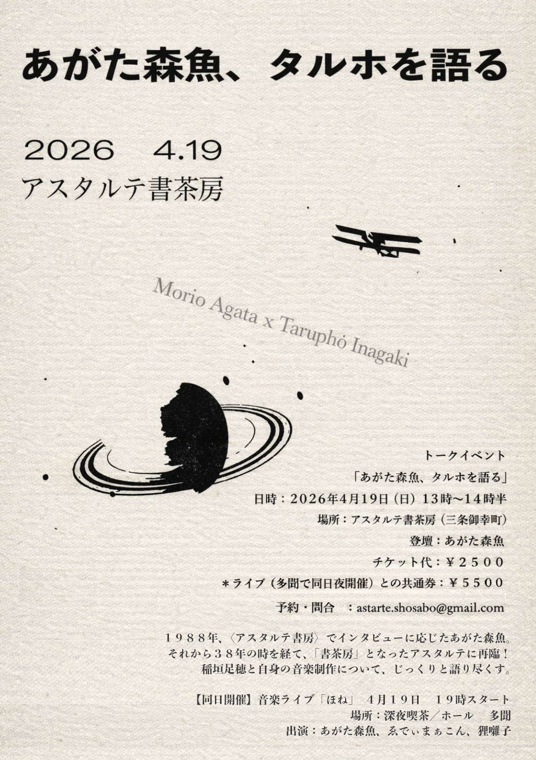 あがたの創作の源泉となり続けてきた稲垣足穂の宇宙。タルホをどのように読み、いかにして音楽へと結晶化させるのか。文学と音楽の重なり合いをじっくりと語っていただきます。
